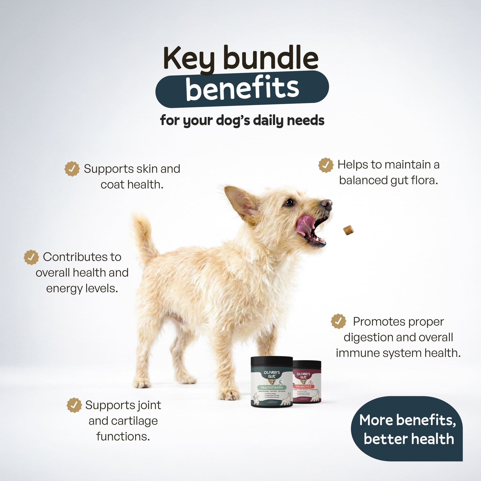 Our Gut & Glow bundle promotes daily wellness by pairing our foundational Multivitamin chews with targeted Probiotics. This duo provides comprehensive support for hip and joint, healthy skin and coat, sustained energy, balanced digestion, and overall immune health.