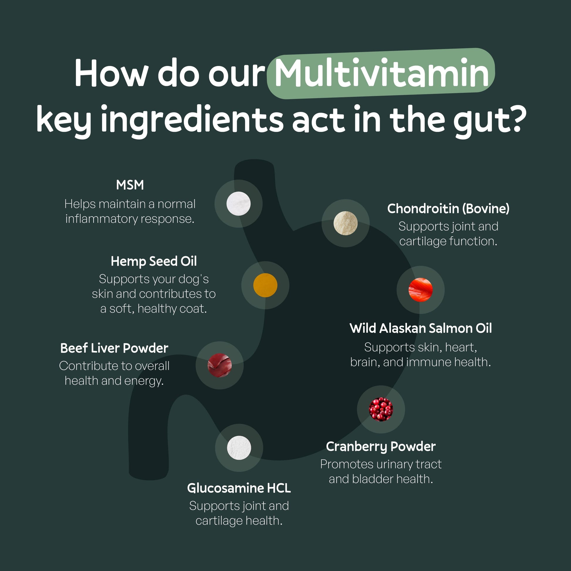 Glucosamine HCL (Vegan) 500 mg, Cranberry Powder 400 mg, Beef Liver Powder 250 mg, Wild Alaskan Salmon Oil 200 mg, Chondroitin (Bovine) 150 mg, Hemp Seed Oil (Omega 6) 100 mg, Blueberry Powder 100 mg, MSM 60 mg, Vitamin C 30 mg, Vitamin B1 5 mg, Vitamin B3 5 mg, Vitamin B5 5 mg, Vitamin E 5 IU, Vitamin B2 1 mg, Vitamin B12 1 mg, Vitamin B6 1 mg, Manganese Gluconate 1 mg, Zinc 1 mg, Folic Acid (Vitamin B9) 0.5 mg, Biotin (Vitamin B7) 0.05 mg.