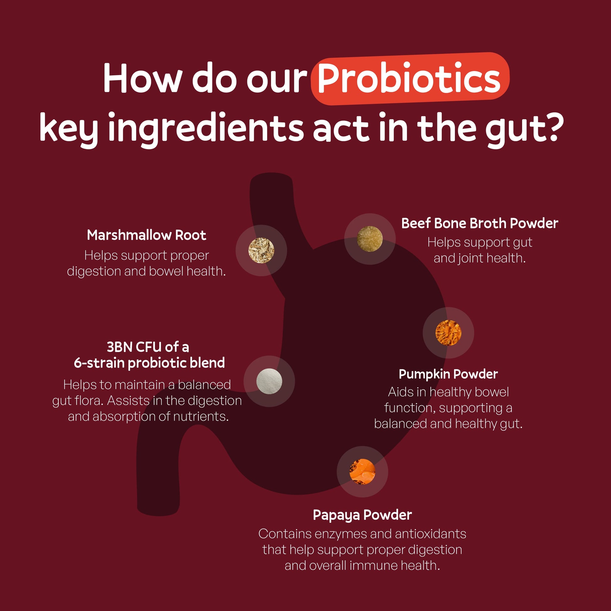 Pumpkin Powder 800 mg, Beef Bone Broth Powder 250 mg, Papaya Powder 200 mg, Marshmallow Root 20 mg, 6-Strain Probiotic Blend (Lactobacillus acidophilus, Lactobacillus casei, Lactobacillus plantarum, Bifidobacterium bifidum, Lactobacillus lactis, Lactobacillus fermentum) 3 Billion CFU.